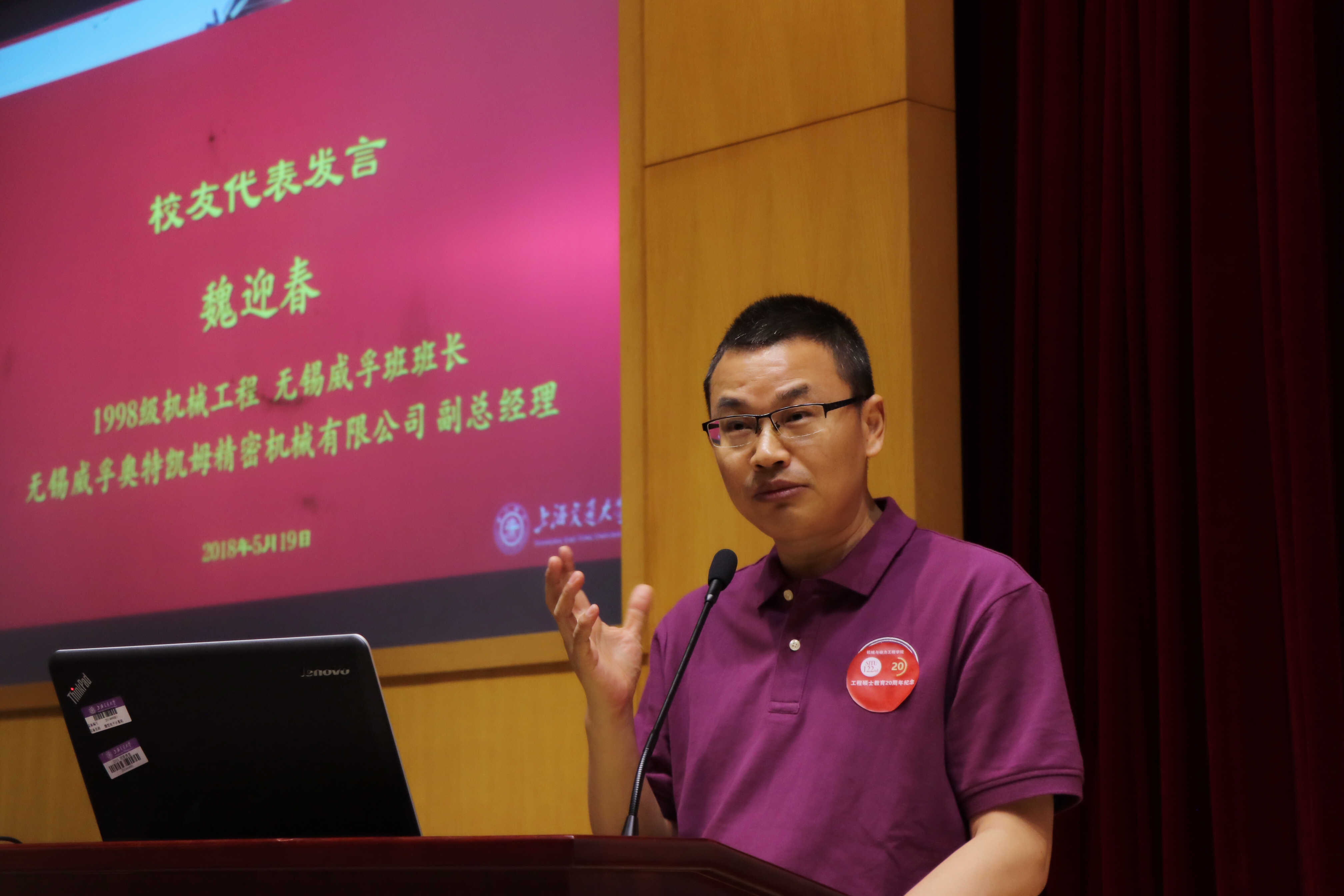 校友代表、1998级机械工程领域无锡威孚班班长,无锡威孚奥特凯姆精密机械有限公司副总经理魏迎春先生发言,回顾了自己当年的边工作边读书的求学历程,肯定了交大所倡导的务实精神对自己工作和成长的影响,魏先生表示无论自己身处任何岗位,交大校友的身份都会促使他追求卓越,不断进步。交大的校训:“饮水思源,爱国荣校”为自己带来了极深的影响,“今天我以交大为荣,今后也将继续努力,争取能让交大以我为荣。”此外,魏先生还指出了如今名校毕业生大多不愿意进入机械加工专业的现状,认为应届生机械加工基础理论不扎实,对行业重要性的认识还不够。他希望大家能沉下心来,同时也希望能借助母校的力量推动加工行业的智能化发展。
